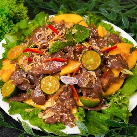 Pha nước trộn gồm đường, muối tôm, nước cốt tắc, nước mắm và tương ớt, khuấy đều. Cho bò nguội vào tô lớn, trộn trước với một phần nước sốt cho thấm. Sau đó cho xoài, sả, tắc lát, ớt sợi vào, rưới hết phần nước sốt còn lại rồi trộn nhẹ tay. Cuối cùng thêm húng lủi và mè rang, đảo nhẹ lần cuối.