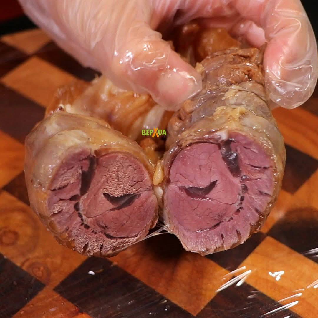 • Vớt bò ra, cho ngay vào tô nước đá lạnh ngập mặt thịt.