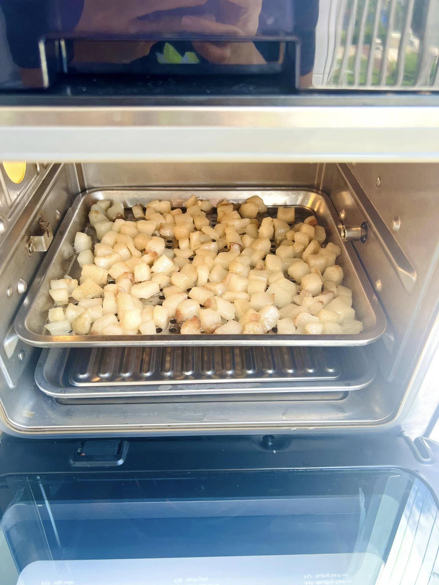 – Mỡ gáy rửa sạch cho vào nồi sấy nhiệt độ 120 thời gian 20phut, sau đó cắt nhỏ hạt lựu.
